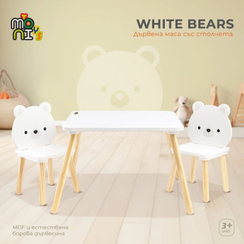 Очарователният детски комплект White Bears от Moni Toys включва маса и два стола с облегалки под формата на сладки бели мечета. Подходящ е за игра, рисуване, учене и хранене – всичко в едно уютно и забавно пространство за вашето дете.
