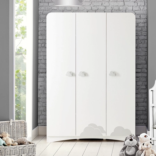 Трикрилен детски гардероб PORI перфектното допълнение към всяка детска стая, благодарение на своя нежен цветови тон и симпатичен дизайн във формата на облак. Със своята бяла визия и релефни дръжки от ABS материал, оформени като облачета, той не само придава свежест и стил на помещението, но и гарантира дълготрайна и безопасна употреба. Функционалността му е впечатляваща – предлага голямо пространство за окачване на дрехи и интегрирано сензорно LED осветление. Рафтовете са изключително здрави и могат да издържат до 25 кг, като същевременно предоставят възможност за лесно премахване и пренареждане според нуждите. Това позволява оптимално използване на пространството и организиране на вещи с различни размери.