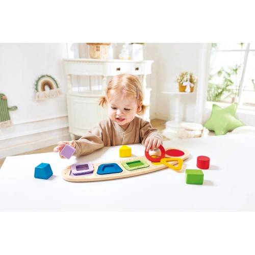 Този пъзел, вдъхновен от Монтесори, има различни цветни форми и текстури, които разпалват въображението и развиващите се мозъци. Това е чудесен начин децата да научат за основните геометрични форми и цветове по забавен и образователен начин. Комплектът включва дървена основа с различни дупки и цветни елементи за сортиране, които малките деца трябва да съчетаят по форма и цвят. Изработена от висококачествена, безопасна дървесина с нетоксични бои, играчката е проектирана с внимание към детайлите и комфорт за малките ръчички. Тя помага за развитието на фината моторика, логическото мислене, координацията око-ръка и уменията за разпознаване и групиране.