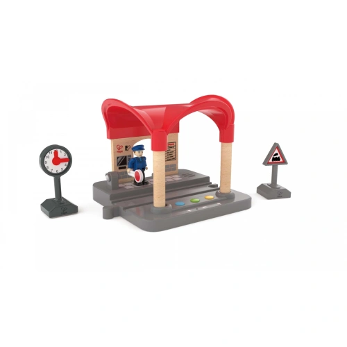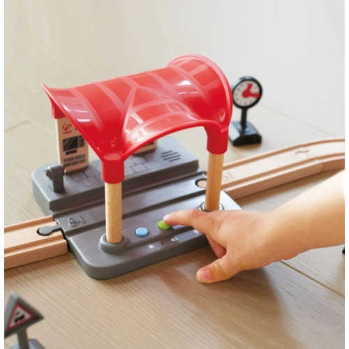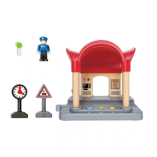 Подобрете света на вашият мини кондуктор с гарата, която говори, свети и възпроизвежда персонализирани звуци! Първо, научете детето си да записва собствените си съобщения на гарата. След това го оставете да натисне бутона за възпроизвеждане, за да чуе собствения си глас да ехти из гарата. Това е не само забавно, но и насърчава креативността. Използвайте бутона за светлина и звук, за да го научите на концепцията за влаковите сигнали и да добавите нотка реализъм към играта.
