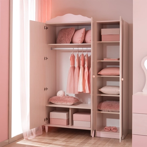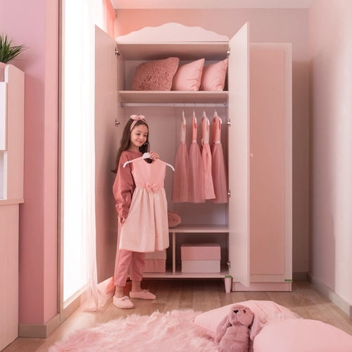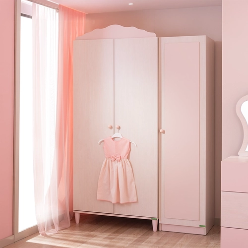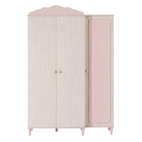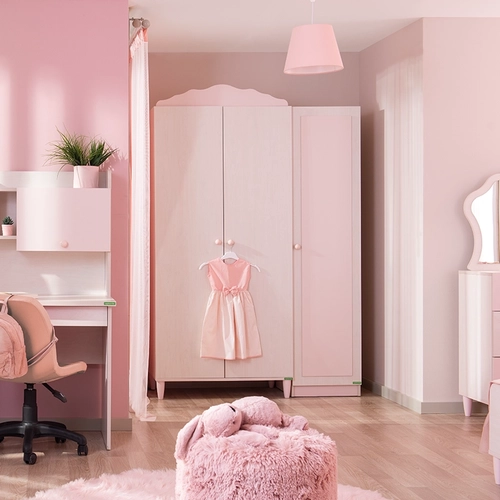 Гардеробът POLLINA с 3 врати комбинира мек розов акцент и светла дървесна текстура, създавайки нежна и хармонична атмосфера в детската стая. Модулната му конструкция позволява монтаж както отляво, така и отдясно, което го прави изключително адаптивен към различни разпределения в интериора.Моделът предлага широко място за закачалки със сензорно LED осветление, регулируеми рафтове с товароносимост до 25 кг и плавно затварящи се врати.