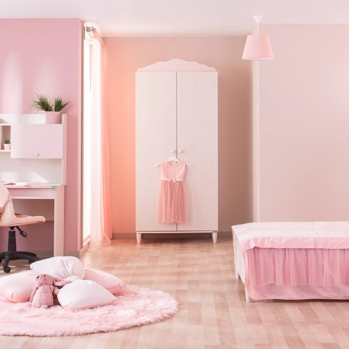 Двукрилният гардероб POLLINA е елегантно и практично решение за подредено и стилно детско пространство. Компактният му размер го прави подходящ както за по-малки стаи, така и като допълнение към по-голямо обзавеждане от същата серия. Моделът предлага широко място за закачалки със сензорно LED осветление, регулируеми рафтове с товароносимост до 25 кг и врати със спирачка за плавно и безшумно затваряне. ABS дръжките са удобни и издръжливи, а високите ABS крачета (12 см) позволяват почистване с робот прахосмукачка. Изработен е от 18 мм ПДЧ сертифицирано за безопасност – идеален избор за детска среда.