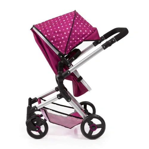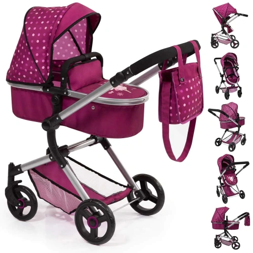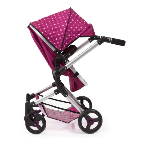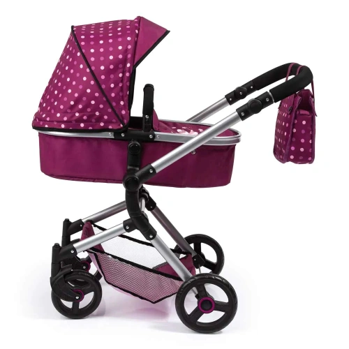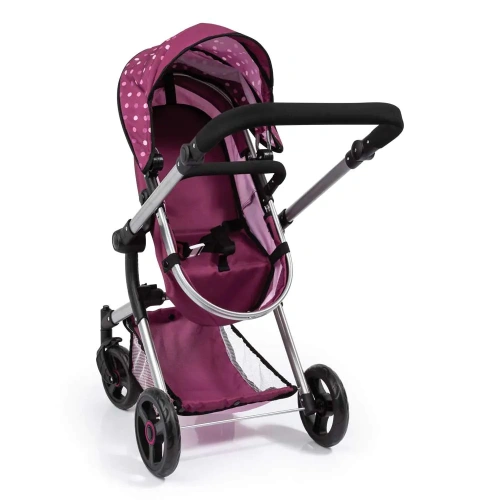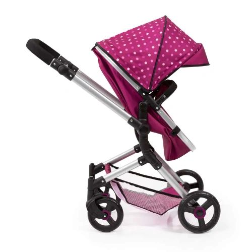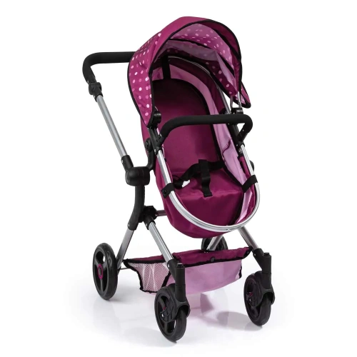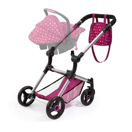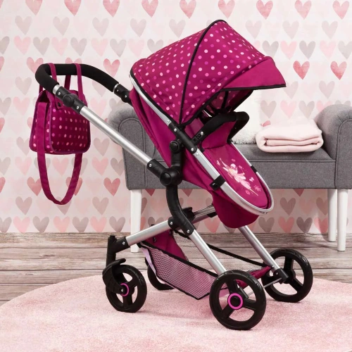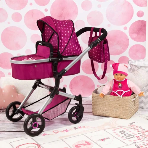 Характеристики: Количката е с кош със свеж цвят и модерен дизайн. Подходяща е за кукли до 52 см. Трансформираща се. Сгъваема рамка за лесно съхранение и транспортиране. В долната част има кош за малки принадлежности. Регулируема дръжка с възможност за смяна на посоката. Височината на дръжката се регулира с височина от 68 до 86 см. Допълнителна чанта за принадлежности.