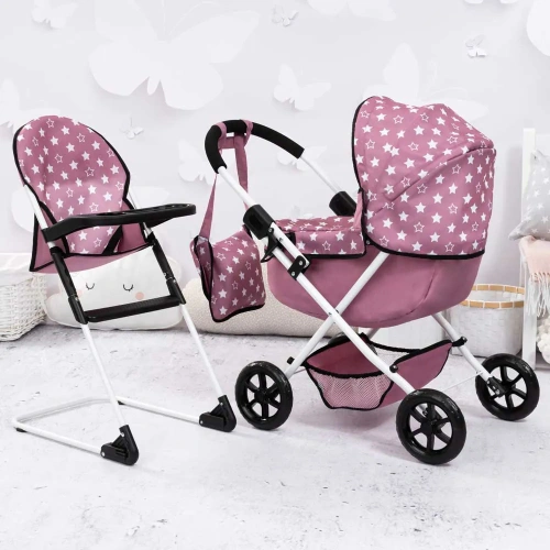 Второ име Количка за детски кукли с чанта COSY и столче за хранене розови