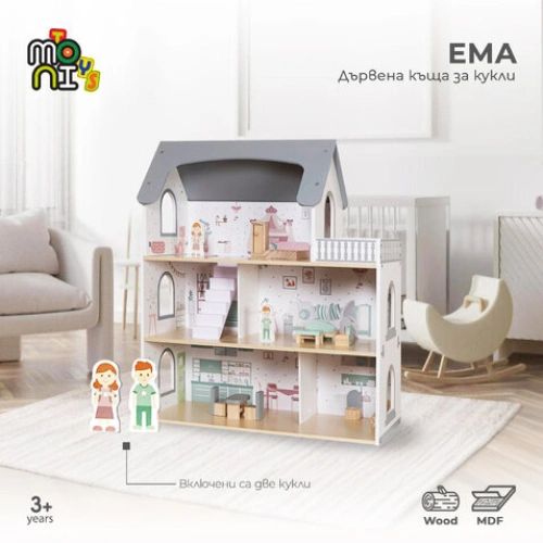 Поднесете незабравими часове игра с тази красива дървена къща за кукли Ema от Moni Toys на 3 етажа! Играчката предлага реалистичен дизайн и богати възможности за ролеви игри, които развиват въображението и социалните умения на децата.