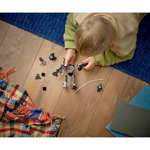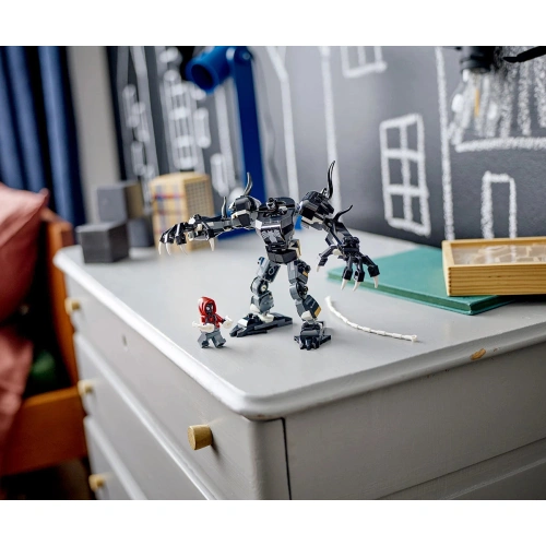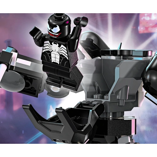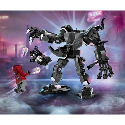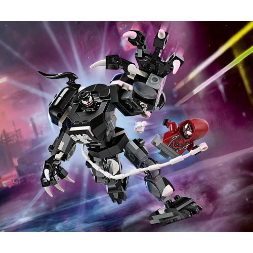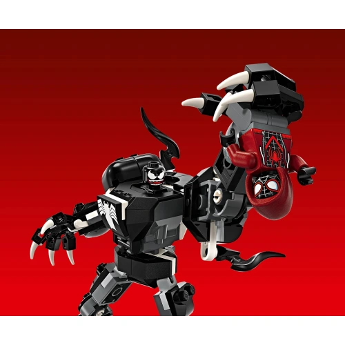 Роботът на Венъм за конструиране има подвижни рамене, крака и ръце с нокти, които са достатъчно големи, за да държат минифигура. Гръдният му кош се отваря, за да разкрие кабина за минифигурата на Венъм. Комплектът също така включва минифигура на Майлс Моралес с 2 ръчни оръжия, изстрелващи паяжина, и гъвкаво „въже“ от паяжина, което може да бъде прикрепено към робота на Венъм в различни точки. Децата могат да разширят още повече възможностите за игра, като комбинират комплекта за игра с други роботи LEGO Marvel в гамата (продават се отделно). За допълнително цифрово забавление строителите могат да мащабират, да завъртат модели в 3D и да проследяват напредъка си с помощта на забавното, интуитивно приложение LEGO Builder.