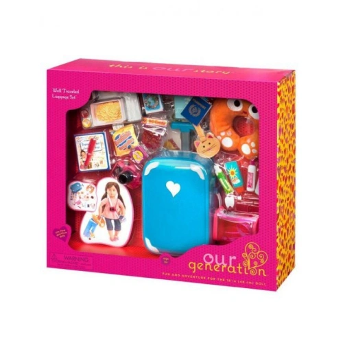 Време е да опознаете и обиколите света с този фантастичен комплект за пътешествия с хиляда изненади. Куфар, възглавничка за път, самолетни билети, фотоапарат, храна и други аксесоари. Всичко необходимо за вашето пътуване. Мисията на Our Generation е да бъде създадена не кукла само за игра, а такава която вдъхновява момичетата да бъдат такива, каквито искат. Куклите и аксесоари OG са представител на това поколение момичета, които имат различни интереси, но все още растат заедно и са приятели с онези, които имат различни истории за разказване. Действат като модел за подражание. Всяка от куклите има уникална история и индивидуалност! Част от продажбите на тези кукли отива в подкрепа на инициативата „Освободи детската сила на момичетата“. Играта с кукли развива в децата паметта. Чрез тях децата измислят сюжети, разрешават различни проблеми. Те са партньор по игра или най-добра приятелка. Изработени са от безопасни и висококачествени материали.
