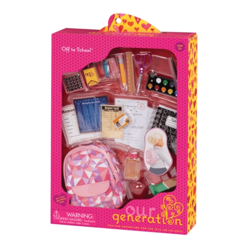 Обратно на училище. Розова раница с два джоба, тетрадки, моливи, ножичка, боички и вкусен обяд. Този комплект ще бъдете готови за първия учебен ден. Мисията на Our Generation е да бъде създадена не кукла само за игра, а такава която вдъхновява момичетата да бъдат такива, каквито искат. Куклите и аксесоари OG са представител на това поколение момичета, които имат различни интереси, но все още растат заедно и са приятели с онези, които имат различни истории за разказване. Действат като модел за подражание. Всяка от куклите има уникална история и индивидуалност! Част от продажбите на тези кукли отива в подкрепа на инициативата „Освободи детската сила на момичетата“. Играта с кукли развива в децата паметта. Чрез тях децата измислят сюжети, разрешават различни проблеми. Те са партньор по игра или най-добра приятелка.