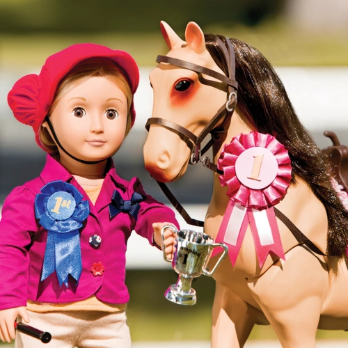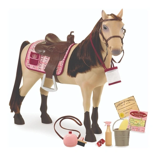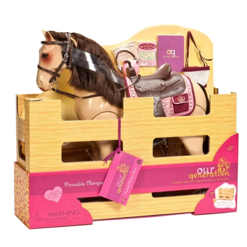 Красив Жребец Морган се отличава с красива тъмно кафява, лъскава грива и опашка. Оседлайте го с красивото розово одеяло и кафявото седло. Използвайте торбата с храна и наградете вашия приятел. След разходка се погрижете за гривата му с аксесоарите в комплекта. Мисията на Our Generation е да бъде създадена не кукла само за игра, а такава която вдъхновява момичетата да бъдат такива, каквито искат. Куклите и аксесоари OG са представител на това поколение момичета, които имат различни интереси, но все още растат заедно и са приятели с онези, които имат различни истории за разказване. Действат като модел за подражание. Всяка от куклите има уникална история и индивидуалност! Част от продажбите на тези кукли отива в подкрепа на инициативата „Освободи детската сила на момичетата“. Играта с кукли развива в децата паметта. Чрез тях децата измислят сюжети, разрешават различни проблеми. Те са партньор по игра или най-добра приятелка.