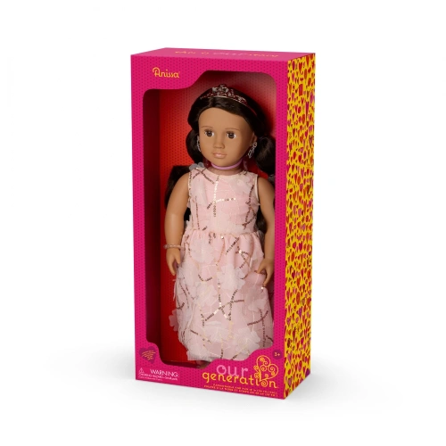 Празнувайте и играйте по блестящи начини с 46-сантиметровата кукла Аниса от Our Generation! Облечена за специални събития и забавни тържества, Аниса блести в розова рокля с флорални мотиви и златни пайети. Тя носи и сладки бижута като диадема, гривна с мъниста и подвижни обеци, които допълват прекрасната ѝ визия! Мекото тяло на Аниса, което може да се прегърне, и реалистичните черти на лицето ѝ ще зарадват феновете на куклите по време на игра. Тя има красиви кафяви очи, които се отварят и затварят, вълниста кестенява коса за оформяне и пробити уши, които добавят допълнителен блясък! Когато дойде време за преобличане, тоалетът ѝ има лесни за отваряне закопчалки, които бързо се слагат и свалят. Така че можете да създадете още по-забавни визии за всяко приключение! Куклите Our Generation са чудесен подарък за деца над 3 години (малки части), насърчавайки ги да си представят свои собствени уникални истории.