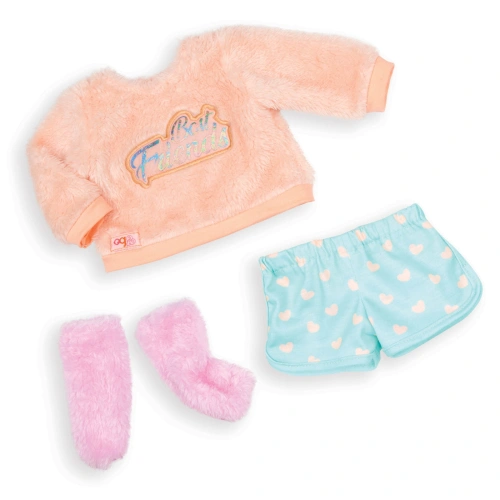 Насърчете приятелството и забавлението с преспиване с Луми! Тази кукла от Our Generation, висока 46 см, има меко тяло, което може да се прегърне, и реалистични черти, за да зарадва феновете на куклите по време на игра на въображение. Косата ѝ се предлага в 2 нюанса за допълнително забавление при стилизирането: ярко розово и аквамариново синьо! Освен това, очите ѝ се затварят, когато е време за сладки сънища! Луми пристига облечена в пухкав пуловер с надпис „Най-добри приятели“, пижамни шорти с щампа на сърца и сладки пухкави чорапи. Облеклото ѝ има и лесно отварящи се закопчалки, които децата бързо могат да обличат и свалят по време на обличане. Така че те могат да смесват, съчетават и създават още сладки комбинации! Куклите Our Generation са чудесен подарък за деца над 3 години (малки части), насърчавайки ги да си представят свои собствени уникални истории.