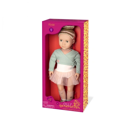 Излезте на сцената с Виола, 46-сантиметрова балерина от Our Generation, която е готова за красиво изпълнение. Тя има реалистични зелени очи, които се отварят и затварят, и дълга руса коса, оформена в красив кок, който е много забавен за разресване и оформяне! Виола е готова за балет, облечена в уютния си зелен топ, сладко розово трико, високи чорапи със сребърна декорация и балетни обувки. Тя дори има блестяща розова лента за глава за допълнителен стил! Облеклото на Виола може да се комбинира с други цветни дрехи за кукли от Our Generation, така че тя да може да празнува с приятелите си в нов тоалет след рецитала си!