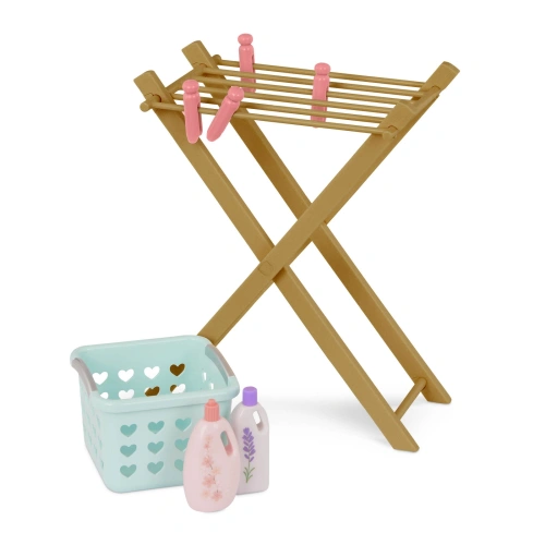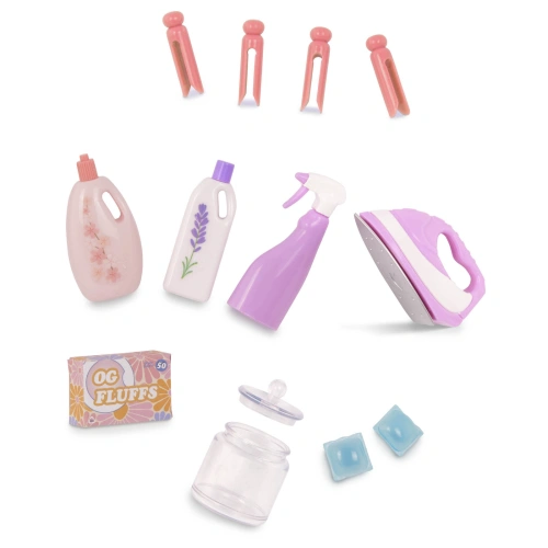 Комплектът Our Generation за 46-сантиметрови кукли е с най-новото, за да запази дрехите в най-добрия им вид! Вземете тоалета на куклата си от коша за пране и го плъзнете в пералнята, когато е готов за пране. След това пуснете пералнята, за да се върти като истинска пералня! Закачете дрехите им на сгъваемата решетка за сушене, за да досъхнат, и използвайте ютията и дъската за гладене, за да се отървете от евентуални гънки. Комплектът се предлага дори с бонус принадлежности за пране, като кутия с кърпи за сушилня, 2 капсули с перилен препарат, бутилка перилен препарат, омекотител, препарат за премахване на петна, 4 щипки за дрехи и буркан за съхранение. Дава на децата всичко необходимо, за да играят на къщичка с куклите си и да научат колко е важно чистотата. Стилно допълнение към къщичките за кукли и аксесоарите за мебели за кукли. Съвместим с повечето 46-сантиметрови кукли, дрехи за кукли и аксесоари. Аксесоарите Our Generation са чудесен подарък за деца над 3 години (малки части), насърчавайки ги да създава