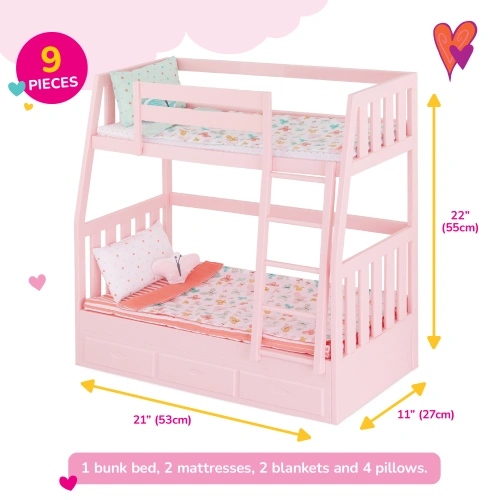 Удвоете забавлението преди лягане на вашата кукла с комплекта двуетажно легло на Our Generation! Това двуетажно легло за 46-сантиметрови кукли е идеално за близначки или най-добри приятелки кукли, които си правят преспиване. Кой ще е горното легло? Нека куклите ви се редуват! Тези двуетажни легла за кукли са проектирани в ярко розово, разполагат с вградена стълба за достигане до горното легло и са лесни за сглобяване. Просто щракнете частите заедно, сложете матраците и спалното бельо и ще сте готови да сложите куклите си в леглото за през нощта! Леглата включват 2 матрака от пяна, покрити с плат, 4 възглавници и 2 одеяла в прекрасни пастелни цветове със сладки шарки на пеперуди. Одеялата са и двуместни. Така че вашите кукли могат да се забавляват, докато преобзавеждат! Леглата „Dream Bunks“ са чудесно допълнение към всяка спалня за кукли и са чудесни и за пижами!