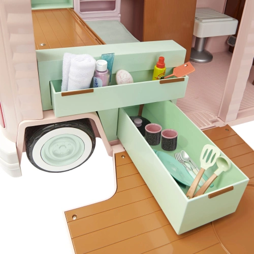 Малките пътешественици могат да пътуват от бряг до бряг и да създават невероятни пътешествия с комплекта Our Generation Country Cruising RV! Този впечатляващ кемпер за 46-сантиметрови кукли е пълен с интерактивни функции, включително светлини, подвижен волан и чистачки, въртящи се колела, клаксон и GPS навигация, която възпроизвежда 8 звука! Децата ще открият и напълно оборудвана кухня и вградена баня вътре в кемпера. Той се разгъва, за да разшири зоната за хранене и да създаде място за къмпинг. Освен това се предлага с над 55 допълнителни части, за да заредите кемпера за всяко забавно приключение! Кемперът Our Generation RV е чудесен подарък за фенове на кукли и малки пътешественици на възраст 3+ (малки части). Съвместим с повечето 46-сантиметрови кукли и аксесоари.