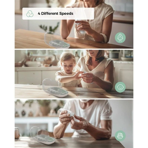 Бебешката електрическа пила за нокти Momcozy включва 4 резервни накрайника за бебета и 3 накрайника за грижа за възрастни. Разполага с 4 степени на скорост на пилене, подходяща както за новородени и бебета от 0 до 36 месеца, така и за всички членове на семейството.