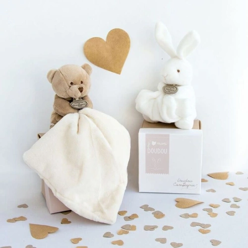 Това е бяла играчка плюшен заек с кърпичка от Doudou. Забележително меко, това малко зайче ще се превърне в най-добрия приятел на бебето.