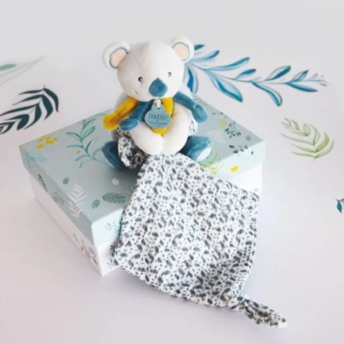 Тази плюшена играчка коала от Doudou е впечатляваща! С очарователното си лице, фините си хармонии от много модерни цветове, смесицата от много меки материали и щрихите си от пелени с растителни шарки, тя ще знае как да привлече с голяма нежност млади и стари.