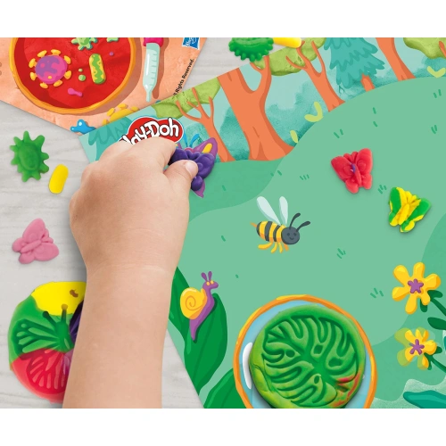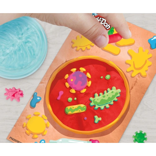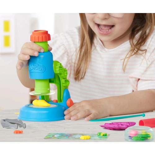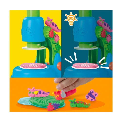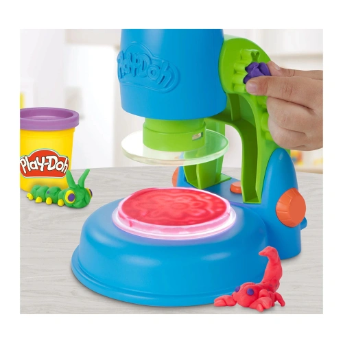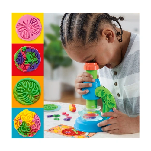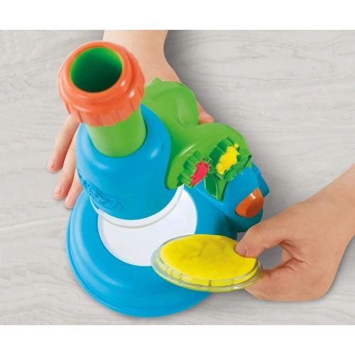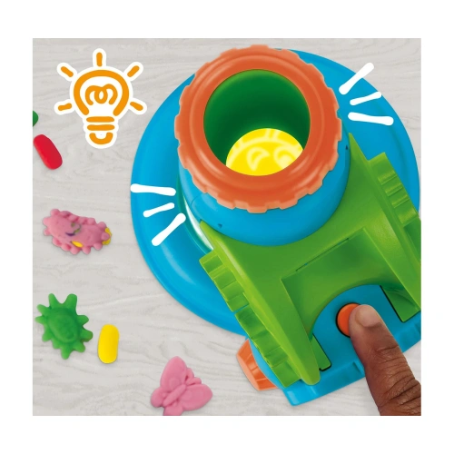 Play-Doh микроскоп със светлина и лупа – забавна наука и творчество в едно! Светът на чудесата и въображението оживява с комплекта Play-Doh микроскоп със светлина и лупа! Този светещ микроскоп добавя вълнуващ светещ ефект към Play-Doh творенията, които децата могат да създават върху 4 прозрачни слайда. Просто избери слайд, напълни го с цветен пластилин и натисни микроскопа надолу – формирай, изследвай и се вдъхнови! Създавай растения, буболечки и микроби от Play-Doh, които после да разгледаш в „петриева паничка“. Комплектът включва и тематична постелка, 2 активити карти и 5 кутии Play-Doh пластилин, които вдъхновяват за безкрайна изследователска игра. Идеален подарък за деца над 3 години – обединява изкуство, наука и въображение в едно уникално изживяване!