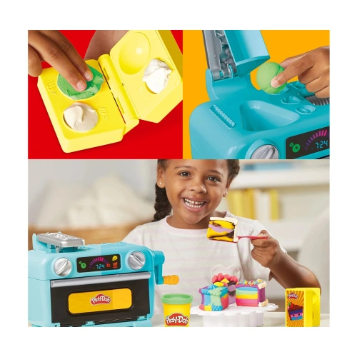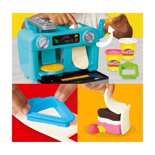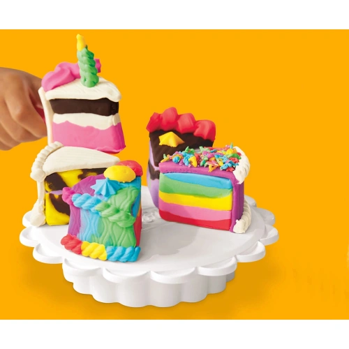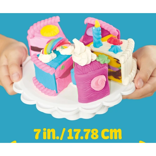 Превърни всеки ден в цветен празник с Play-Doh Комплект за рязане на торта! Създавай вкусно изглеждащи торти и парчета с въображение и цветен Play-Doh пластилин! Този творчески кухненски комплект позволява на децата да моделират, украсяват и „сервират“ свои собствени торти по забавен и лесен начин. Просто оформи топки от Play-Doh пластилин, постави ги във фурната и натисни дръжката – ще чуеш звънче и ще видиш как парче торта изскача навън! Създавай цветни слоеве или смеси цветовете за красив мраморен ефект. Използвай вградения валяк за глазура и формички за декорация, за да придадеш на всяко парче още по-вкусен вид. С помощта на инструмента за украсяване можеш да добавяш декоративни \"розички\", захарни бонбони и фигурки от Play-Doh.