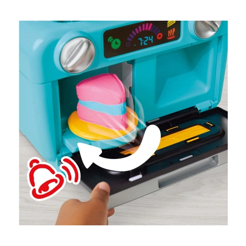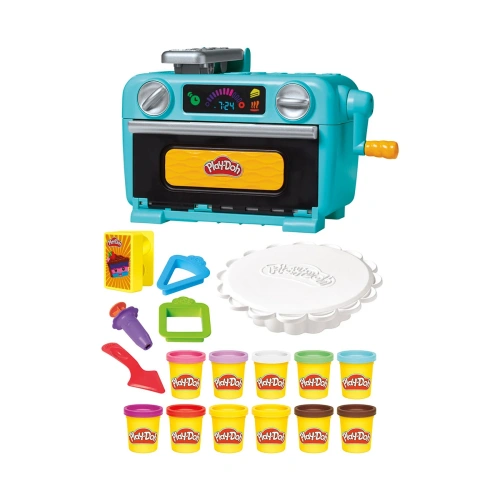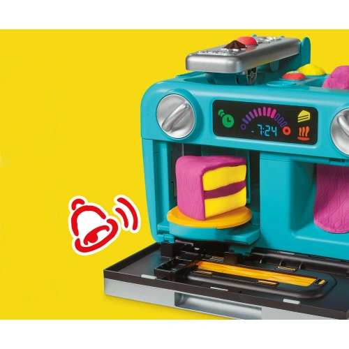 Превърни всеки ден в цветен празник с Play-Doh Комплект за рязане на торта! Създавай вкусно изглеждащи торти и парчета с въображение и цветен Play-Doh пластилин! Този творчески кухненски комплект позволява на децата да моделират, украсяват и „сервират“ свои собствени торти по забавен и лесен начин. Просто оформи топки от Play-Doh пластилин, постави ги във фурната и натисни дръжката – ще чуеш звънче и ще видиш как парче торта изскача навън! Създавай цветни слоеве или смеси цветовете за красив мраморен ефект. Използвай вградения валяк за глазура и формички за декорация, за да придадеш на всяко парче още по-вкусен вид. С помощта на инструмента за украсяване можеш да добавяш декоративни "розички", захарни бонбони и фигурки от Play-Doh.