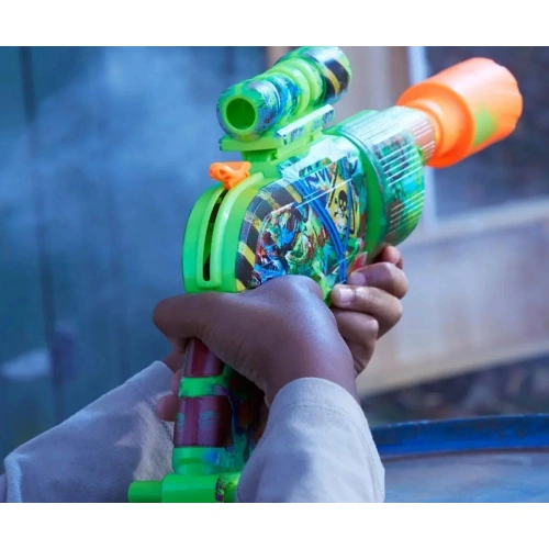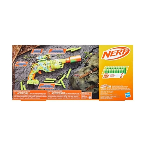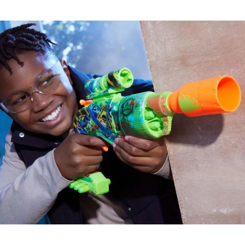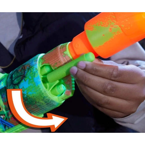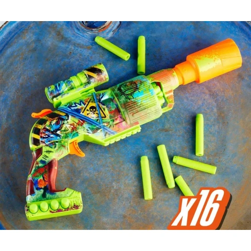 Дартс бластерът Nerf Zombie Driller е изцяло украсен с цветни, грабващи окото и вдъхновени от зомбита графити от двете страни. Дизайнът на бластера създава вида на бойна екипировка, която зомби бойците биха създали в свят, завладян от зловещите немъртви. Бластерът Zombie Driller е проектиран да изглежда като бормашина, превърната в бластер за борба със зомбита. Има въртящ се цилиндър с капацитет за 5 стрели и включва 16 стрели от пяна Nerf Elite и подвижен мерник Nerf. Отличаващ се със забавни детайли от край до край, бластерът Nerf Zombie Driller е страхотен за феновете на зомбита и идеален аксесоар за зомби партита, игри и събития. Бластерите за играчки Nerf са страхотни играчки на закрито и на открито за деца на възраст над 8 години, за да се насладят на забавна и активна игра.
