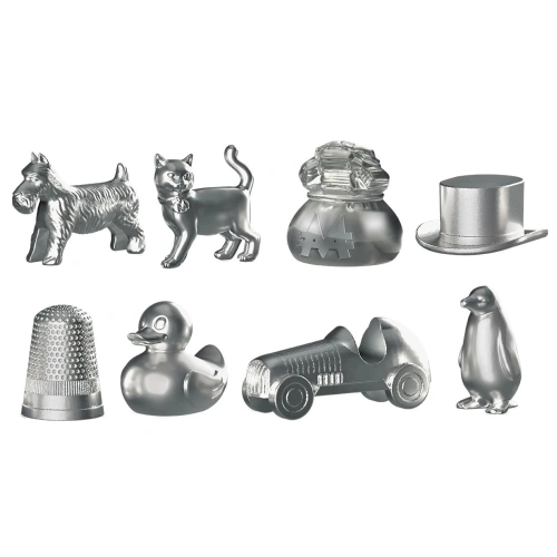 Избери между 8 фигурки от Монополи, по-големи от предишните издания: кученцето Скот, котката Хейзъл, състезателна кола, цилиндър, напръстник, пате, пингвин и чувал с пари;