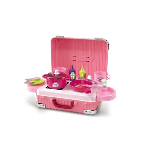 Мобилна кухня за малки готвачиРозовата кухня под формата на куфар е идеална играчка за деца, които обичат да готвят и да играят ролеви игри. След разгъване тя се превръща в пълноценен кухненски комплект с много аксесоари. Благодарение на компактната си конструкция и дръжката, куфарчето може да се вземе навсякъде – в градината, на пътуване, на пикник или при баба и дядо.