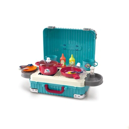 Синята кухня под формата на куфар е идеална играчка за деца, които обичат да готвят и да играят ролеви игри. След разгъване тя се превръща в пълноценен кухненски комплект с много аксесоари. Благодарение на компактната си конструкция и дръжката, куфарчето може да се вземе навсякъде – в градината, на пътуване, на пикник или при баба и дядо.