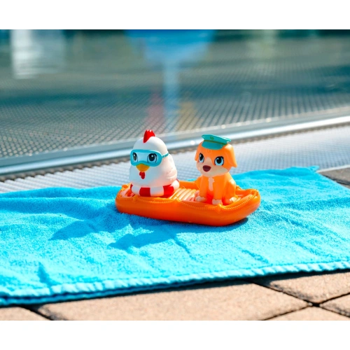 Изследвайте света по игрив начин с ABC! Продуктите на ABC, подходящи за възрастта, насърчават естественото любопитство на бебета и малки деца от 0 до 36 месеца и подпомагат ранното им развитие. Игралният подход гарантира постигането на начални учебни цели, открития на форми и структури и обучение на координационни модели. Корабче с животински фигури - На оранжевото корабче децата могат да поставят две винилови животни (куче и пиленце) на борда, за да изживеят вълнуващи морски приключения. Виниловите животни са проектирани да се прикрепят лесно към корабчето, което игриво подобрява фината моторика на децата. Корабчето и фигурките на животните са изработени от водоустойчив материал, идеален за забавление при къпане или игра в басейна за плуване, тъй като корабчето с животните може да плава във водата.