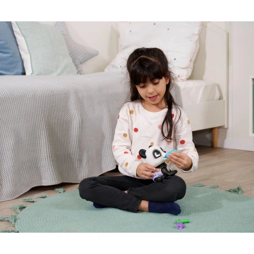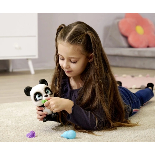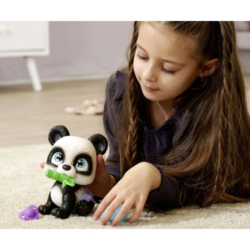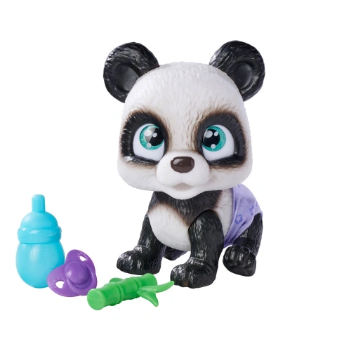 Серията Pamper Petz включва колекция от сладки животни с памперси, които искат да бъдат нахранени и обгрижвани, търсейки своя собственик, който да ги осинови, да им даде име и да ги дари с любов. Тази сладка черно-бяла панда с големи светлосини очи е в опаковка и чак след като бъде отворена, Вие ще разберете нейния пол. Тя може да пие вода от бутилката, след което ще се изпишка в пелената, която пожълтява, като истински домашен любимец. Комплектът включва и три изненади за грижа и хранене. Пандата може да държи аксесоари в устата си. Хартиената кутия с дръжка, в която е опакована пандата, може да се използва като преносима къщичка за домашен любимец. Това е идеален подарък за момчета и момичета. Допълнително комплектът включва сертификат за осиновяване на домашен любимец!