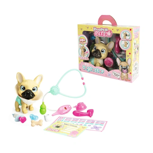 Всяко дете мечтае да има домашен любимец, с който да играе и за който да се грижи. Това очарователно малко куче Френски булдог ще донесе много емоции на своя нов собственик. Кучето е приятно на допир, леко и удобно за детските ръчички. Комплектът включва всички необходими ветеринарни инструменти, за да се погрижите за него, ако се нарани: стетоскоп с функция за сърцебиене, клиничен нашийник за кучета, термометър, спринцовка, УНГ инструмент, стикери, кокал и много други. Кученцето може да пие вода от собствената си бутилка и да пишка в пелената си. Когато се намокри, пелената променя цвета си. Кучето има подвижна глава и лапи, което ще ви осигури страхотно забавление. Както всички животни на Pamper Pets, това кученце се доставя с официален акт за раждане и ветеринарен паспорт. Докато играе, детето се учи да се грижи за животните. Серията Pamper Petz включва колекция от сладки животни с памперси, които искат да бъдат нахранени и обгрижвани, търсейки своя собственик, който да ги осинови, да им даде име и да ги