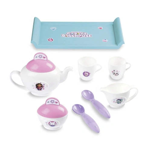 Този нежно проектиран комплект за чай в стил Gabby's Dollhouse ще накара сърцата на малките фенове на Габи да заиграят! Комплектът от посуда, изработен от висококачествена пластмаса, е особено здрав и лесен за почистване. Чаения сервиз на Габи съдържа общо 8 аксесоара, включително поднос, чайник с капак, захарница с капак, каничка за мляко, две чаши и две лъжици. Абсолютна необходимост за всички малки любители на чаените партита.
