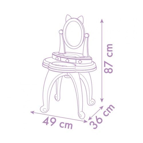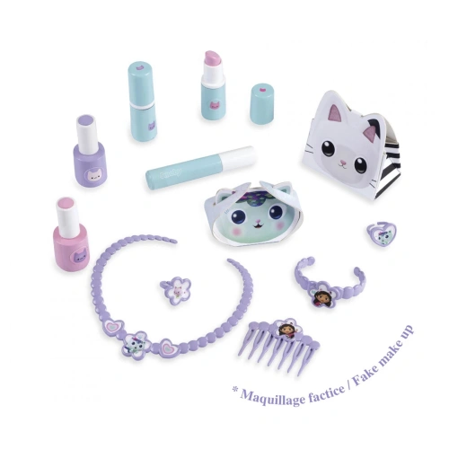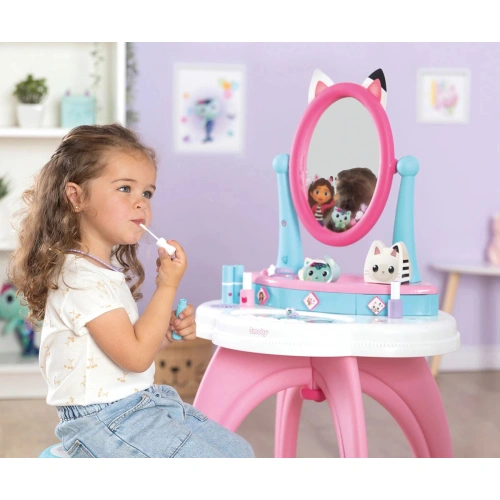 Потопете се в магическия свят на Gabby's Dollhouse и изживейте вълнуващи приключения с очарователните приятели на Габи – Панда Пау и сладките котенца! Открийте магическия фризьорски салон Gabby's Dollhouse от Smoby. Малките кралици на красотата могат да седнат на удобния стол и да стилизират косите си заедно с приятели, братя и сестри. Здравата масичка за грим е проектирана в стил популярния сериал \"Gabby's Dollhouse\" и разполага с въртящо се огледало и три чекмеджета за съхранение на аксесоари. Включените аксесоари включват гребен, колиета, два лака за нокти, две червила, спирала, гривна, два пръстена и две кутии. Масичката Gabby може да се отдели от краката и следователно може да се използва и като плот. Фризьорският салон Smoby е изработен от висококачествени материали във Франция и отговаря на най-високите стандарти за качество за дълготрайно и безгрижно забавление по време на игра.