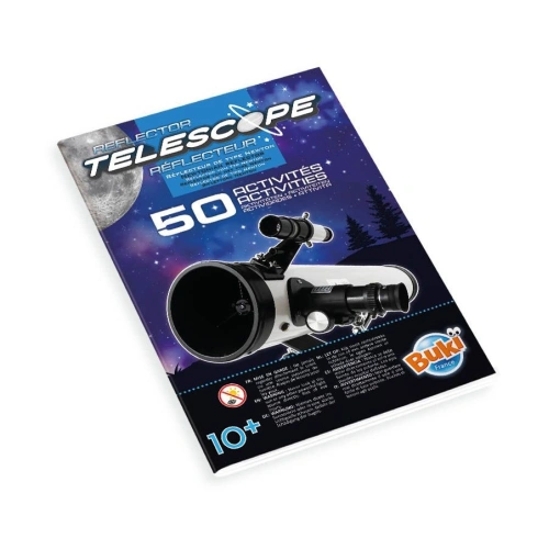 Рефлекторен телескоп, който се предлага с инструкция за 50 дейности за откриване на звездното нощно небе, планетите и лунния пейзаж.