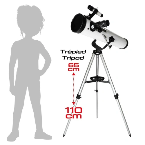 Изцяло метална тръба. Диаметър на апертурата 76 мм и фокусно разстояние 700 мм. Доставени са 3 сменяеми окуляра: 20 мм, 6 мм и 10 мм Келнер. Алуминиев статив с две позиции: 65 см и 110 см. Включени са множество аксесоари: визьор 5x24 мм, 1 леща на Барлоу с 3x увеличение, 1 лунен филтър и 1 карта на нощното небе, които ще ви помогнат да се ориентирате.