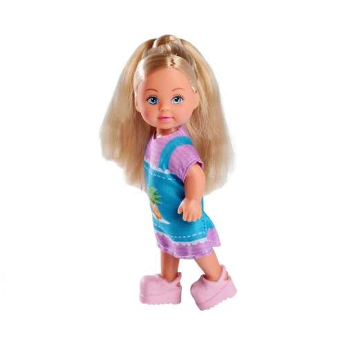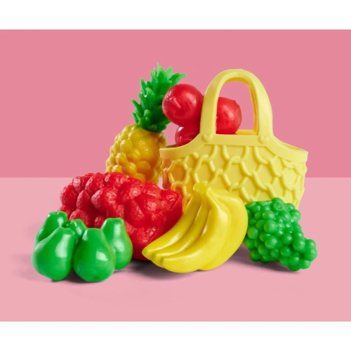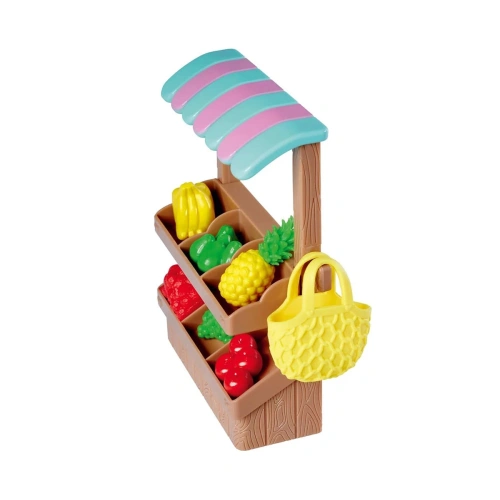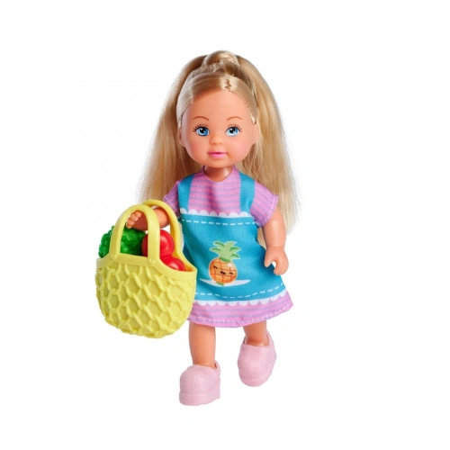 Малката Еви посещава пазара със стилна жълта мрежеста чанта, в която може да опакова всичките си покупки и да ги транспортира до дома. Щандът с плодове разполага с банани, ананас, грозде и ябълки.