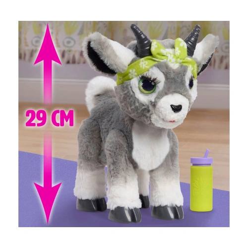 Тази очарователна интерактивна играчка коза с височина 29 см разполага с изключително меко сиво плюшено покритие, блестящи зелени очи и сладка зелена лента за глава;