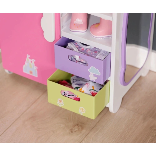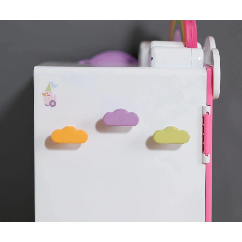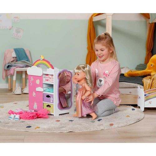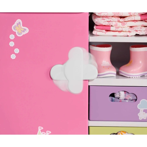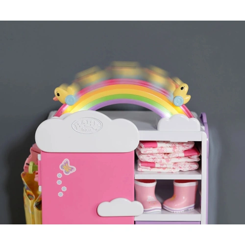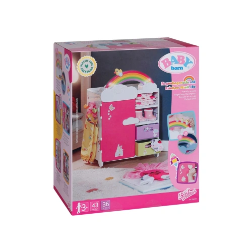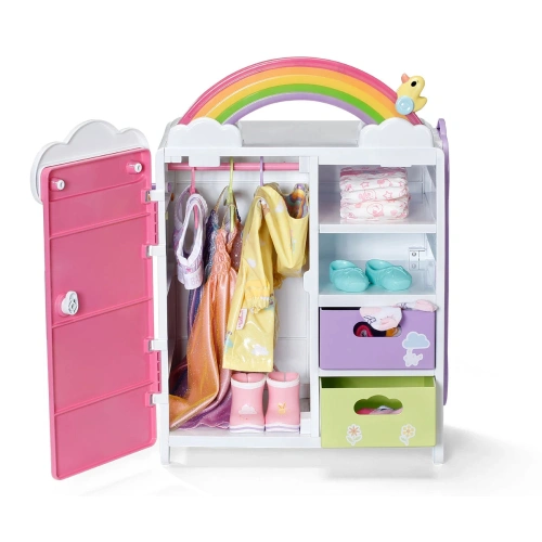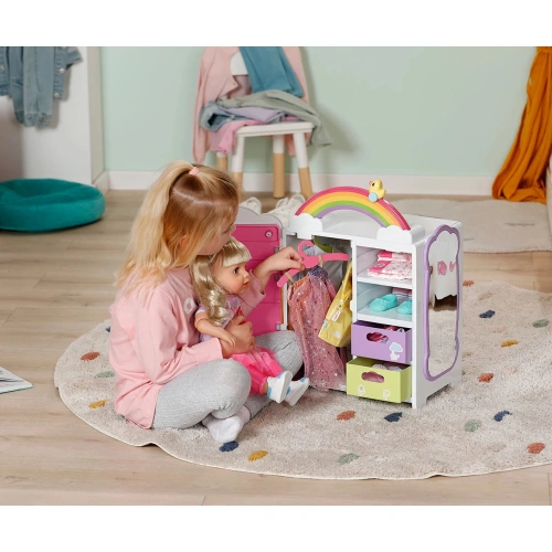 Преобличането е толкова забавно с гардероба Rainbow със светлинни и звукови ефекти от BABY born! Преместването е наистина забавно с гардероба BABY born Rainbow! Докато патицата Берта е бутната над дъгата, тя светва. Берта свири весела мелодия, която я зарежда с добро настроение, докато избира днешното си облекло. Благодарение на релсата за дрехи, рафтовете и подвижните чекмеджета има достатъчно място за дрехите на куклата. Чанти или подобни предмети могат да бъдат окачени на сладките закачалки облаци от външната страна на гардероба. BABY born може да се любува на тоалета си в огледалото в цял ръст. Самият гардероб също може да стане още по-цветен с листа със стикери.