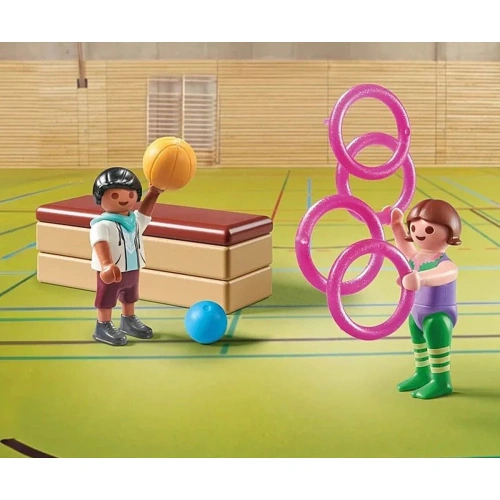 PLAYMOBIL Special Plus гимнастици и гимнастически уреди като топки и обръчи и други. Време е за забавление и фитнес с комплекта PLAYMOBIL гимнастици! С цветни топки за упражнения, които са проектирани за лесен захват, и комплект свързващи обръчи, възможностите за креативно и активно играене са безкрайни. От усъвършенстване на равновесието до овладяване на нови движения, фигурите са оборудвани за вълнуваща гимнастическа сесия.