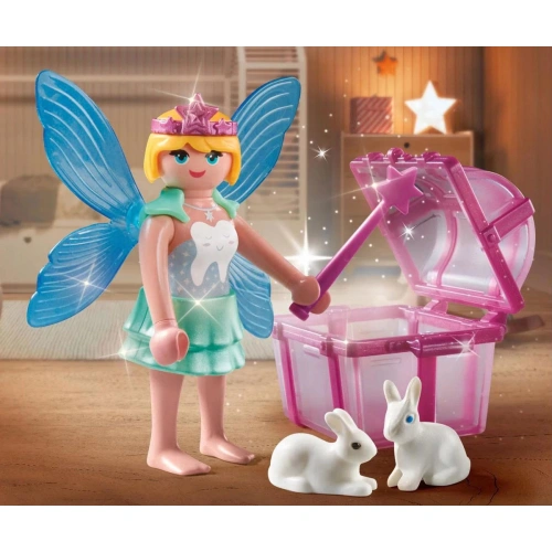 PLAYMOBIL Special Plus Феята на зъбките с вълшебна пръчка, сандък и две зайчета. Разпръснете малко магия по време на съня с комплекта PLAYMOBIL Феята на зъбките! Облечена в своята очарователна рокля, блестящи крила и вълшебна пръчка, феята на зъбките е готова за всяко нощно посещение. Тя носи със себе си малък сандък, готов да съхранява ценните млечни зъбчета. Двете сладки зайчета добавят още повече чар към приключенията на феята на зъбките. Сандъкът е перфектното място, в където да се съхраняват малките зъбчета, правейки комплекта не само забавен, но и практичен. Идеален за създаване на специални спомени, този комплект PLAYMOBIL прави всяко падане на зъбче вълшебно събитие!
