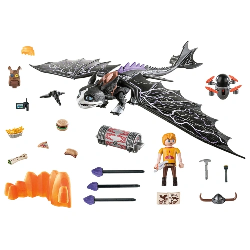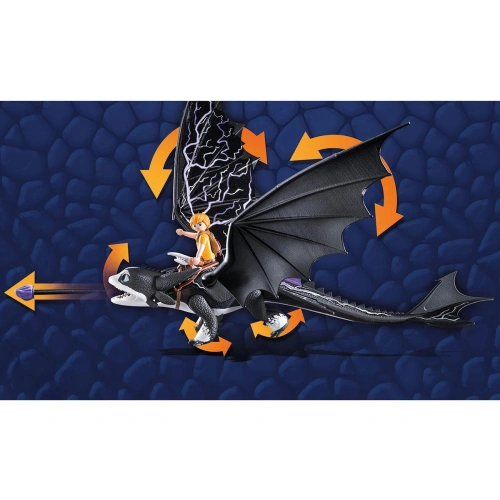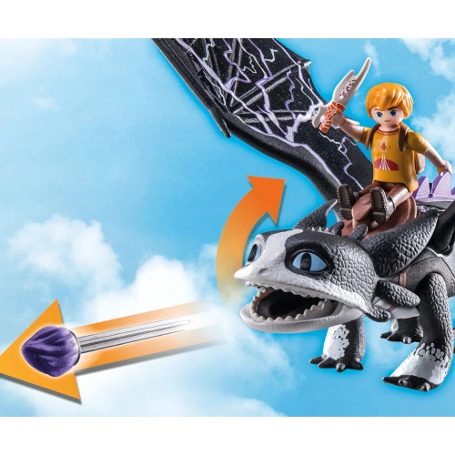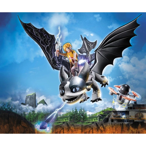 1300 години след събитията от „Как да си дресираш дракон“, драконите сега са просто легенда за съвременния свят. Когато геоложка аномалия отваря огромна, дълбока километри пукнатина в повърхността на Земята, учени от цял свят се събират в ново изследователско съоръжение, за да проучат мистериозния феномен. Скоро група неподходящи деца, доведени на мястото от родителите си, разкриват истината за драконите и къде са се крили - тайна, която трябва да пазят за себе си, за да защитят това, което са открили. Том е умен, млад авантюрист. Отгледан от майка си учен, нейната любопитна природа се е отразила върху него. Том има импулсивна нужда да изследва и проверява нещата, но понякога забравя да вземе предвид последствията. Драконът на Том е Гръм. Дракон от нощна светлина, който е загубил дома си и пътя си, когато пукнатината се е отворила. Nightlights са рожба на Беззъб и Светлата ярост от игралните филми за Дракона. С комплекта за игра Thunder & Tom от PLAYMOBIL вече можете да пренесете забавлението на дракона у дома. Гръмотевицата може да движи и четирите си крака, както и главата и крилата си. Интегрираното седло позволява на Том да язди Thunder. Задните люспи на Thunder включват светлинен модул и той може да изстрелва плазмени стрели от устата си. Това става като вкарате стрела в устата на дракона и след това я затворите. Чрез натискане надолу по главата или ушите, стрелата се изстрелва отново от устата.