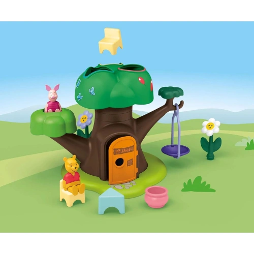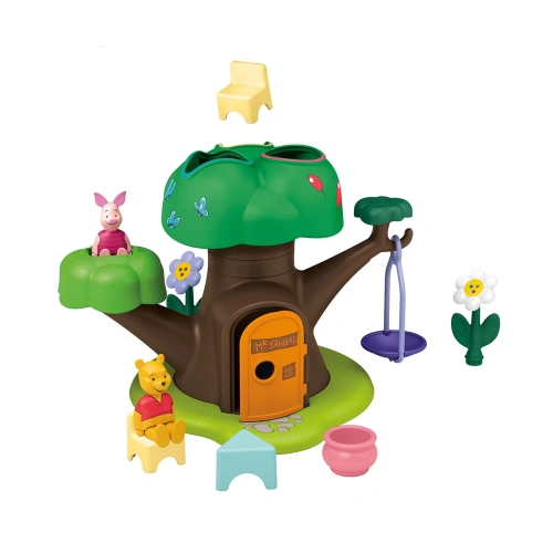 Добре дошли в къщата на дървото на Мечо Пух и Прасчо! Този очарователен комплект за игра, вдъхновен от Disney, гарантира безкрайно забавление: различните функции са идеални за малките откриватели и предлагат множество вълнуващи приключения. От игра до сортиране, подреждане, въртене и дори издаване на звуци, този комплект има всичко! Високото дърво предлага безброй възможности: люлка на клона, използване на короните на дърветата. Кой ще се люлее? Кой ще живее в къщичката на дървото? Колко бързо могат да се въртят Мечо Пух и Прасчо? Колко високо могат да се люлеят? Как звучи бръмбарът? Но чакайте, има още! Дървото е кухо отвътре! Чрез голямата корона на дървото различни мебели и гърнето с мед могат да бъдат сортирани по форма и цвят. Само през правилните отвори аксесоарите могат да преминат през ствола на дървото и да паднат обратно. Можете ли да съпоставите всеки елемент с отворите? В зависимост от това как са поставени цветята, те могат да блокират пътя на предметите. Можете ли да хванете всички използваеми предмети? Персонажите могат да се събират около масата, да се скрият в къщичката на дървото, да се люлеят или да се въртят заедно. Насърчете вашето дете да създава свои собствени творчески истории за приключенията на Мечо Пух и Прасчо. Какви приключения ще преживеят тези двама приятели днес?
