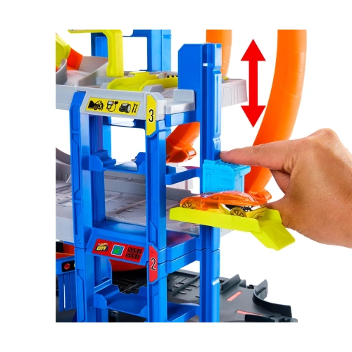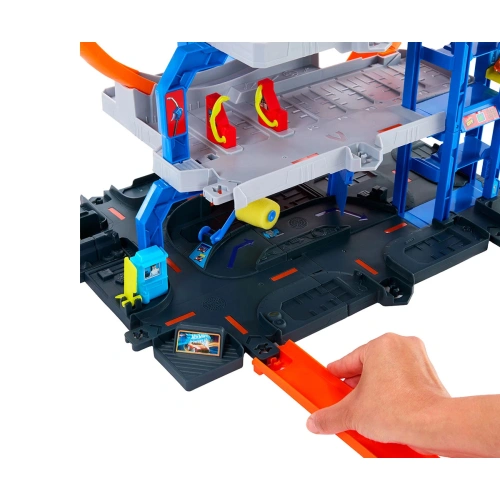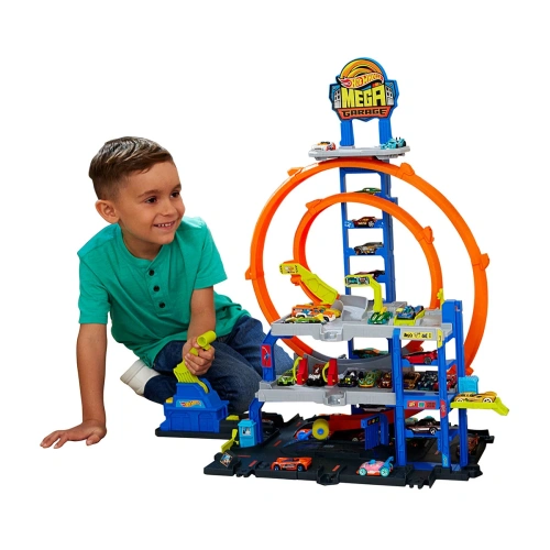 Игралният комплект Hot Wheels City – Мега гараж предлага три нива на екшън и забавление с коли, които вдъхновяват децата за вълнуващи истории и каскади! На приземния етаж на този многоетажен комплект децата могат да преминат през автомивка с въртящ се валяк от пяна и завеса за миене. След това заредете колата в изстрелвачката и я изпратете в двойната примка, където превключватели помагат да стигне до желания етаж. Използвайте асансьор с ръчно задвижване или хеликоптера за пренасяне на коли, за да транспортирате превозните средства до различните нива за паркиране. Можете да разширите играта с помощта на Speed Snap Track конектори.