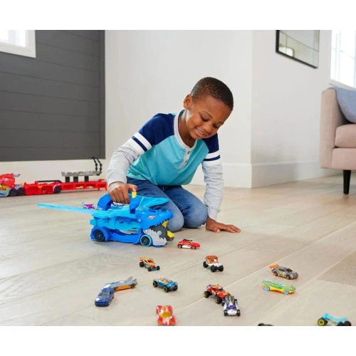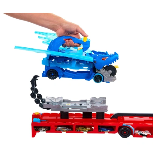Hot Wheels - Двойно драконово действие! Изстреляй се в битка с този голям транспортьор, който включва допълнителен отделящ се дракон, който поглъща колички! След като елиминираш враговете си с огнедишащия дракон, отключи по-малкия дракон и го трансформирай в състезателна писта! Натисни бутона, за да размахаш крилата на дракона и да имитираш истински полет – след това се спусни и изяж количките! Върни се в базата и пусни колите в двоен изстрелвач, за да се впуснат в състезание по паралелни трасета! Комплектът включва 2 колички в мащаб 1:64, а двата дракона могат да съхраняват повече от 20 превозни средства! (Допълнителни колички се продават отделно). Можеш да свържеш Hot Wheels писта отпред, за още по-вълнуваща игра и нови маршрути! (Пистата се продава отделно).