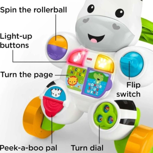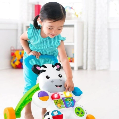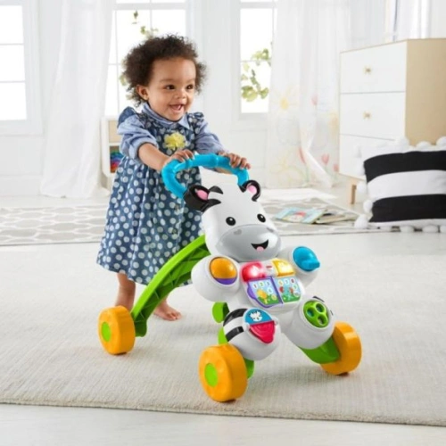 Насърчете първите думи и стъпки на вашето дете с образователната проходилка Fisher-Price Learn With Me Zebra – перфектният първи приятел в голямото приключение на растежа. Със забавни светлини, песнички, фрази и игри, зебрата ангажира детето, докато то седи, играе и учи буквите и числата. Когато дойде време за прохождане, удобната дръжка и стабилната конструкция с четири колела дават на бебето увереност да направи първите си крачки.