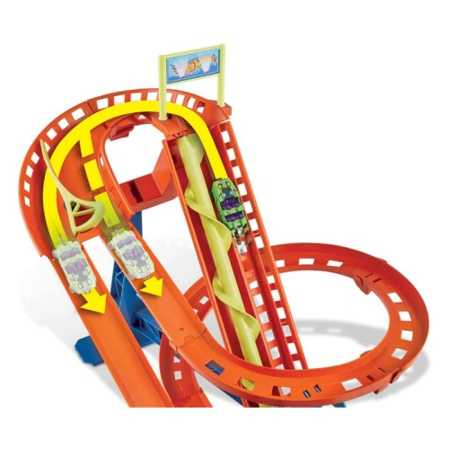 Добре дошли в света на скоростта и забавлението с Hot Wheels City – Roller Coaster Rally! Тази моторизирана писта пресъздава атмосферата на истински увеселителен парк, с лупинги, рампи, стартиращ механизъм и 5 включени Hot Wheels колички, готови за състезание. С динамичен дизайн и моторизирано задвижване, пистата гарантира часове интерактивна игра и зрелищни обрати.