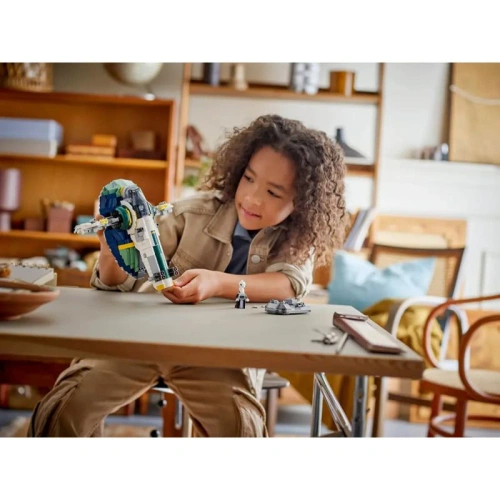 Превъзходен подарък за фенове на Star Wars™, комплектът включва 3 минифигурки: Джанго Фет с 2 бластера и ракетен ранец, младия Боба Фет и Лама Су. Включена е и сервизна количка, която може да се използва за придвижване на кораба в игрови сцени или като поставка за декорация между игрите.