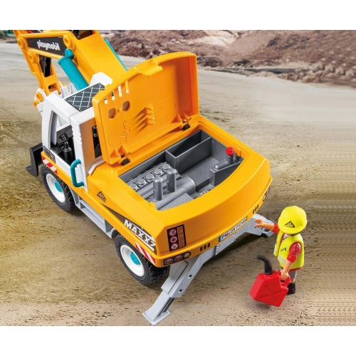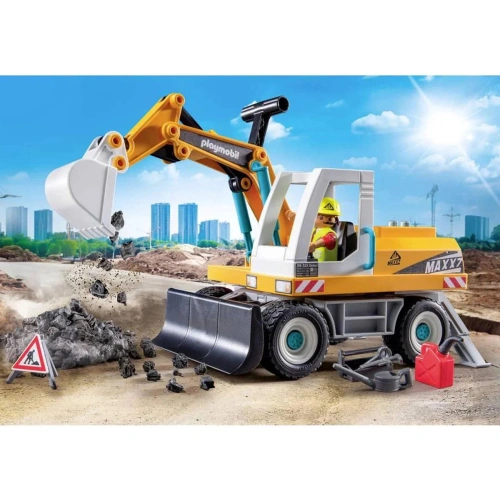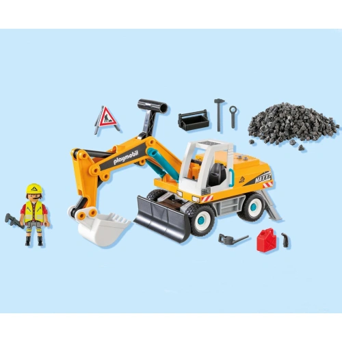 Фенове на копаенето, внимание! - Помогнете на строителния работник с новата, страхотна PLAYMOBIL багер машина с кабина за водача, голяма лопата, дръжка за повдигане и спускане на лопатата и допълнителна лопата за работа на строителната площадка. Той не може да се справи сам. Влезте в строителната площадка с големия багер PLAYMOBIL! Тази впечатляваща машина е готова да се справи с всяка задача. Багерът разполага с просторна кабина за водача, подвижна лопата, която се управлява с лост, и въртяща се на 360° горна част за максимална гъвкавост. Издърпайте поддържащите крака за допълнителна стабилност и започнете лесно да копаете и вдигате. С PLAYMOBIL строителен работник, сваляща се каска и важни аксесоари, децата могат да създадат собствени динамични приключения на строителната площадка. Перфектно за малки копачи с големи фантазии!