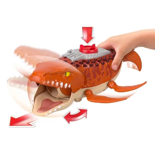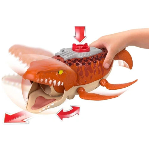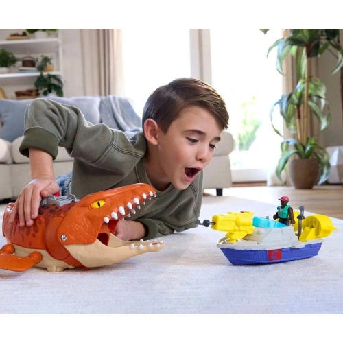 Малките фенове на Jurassic World ще зареват от вълнение заедно с гигантския динозавър в този вдъхновен от филма игрален комплект Imaginext от Fisher-Price! Играчката Моззазавър е с дължина 45 см и разполага със звук и движение, както и с перки и гръбнак с реалистично усещане при допир. Децата могат да натиснат Power Pad за да активират захапващото движение и реалистични звуци, или да бутат динозавъра, за да го видят как се движи напред с мърдаща глава и опашка! Пресъздавайте сцени от Jurassic World: Rebirth с включената 7.5-сантиметрова фигурка и патрулна лодка, оборудвана със сваляем изстрелвач и два снаряда. Децата ще развиват фини двигателни умения и ще се потапят във въображаема игра, докато гонят и хапят по време на забавлението!